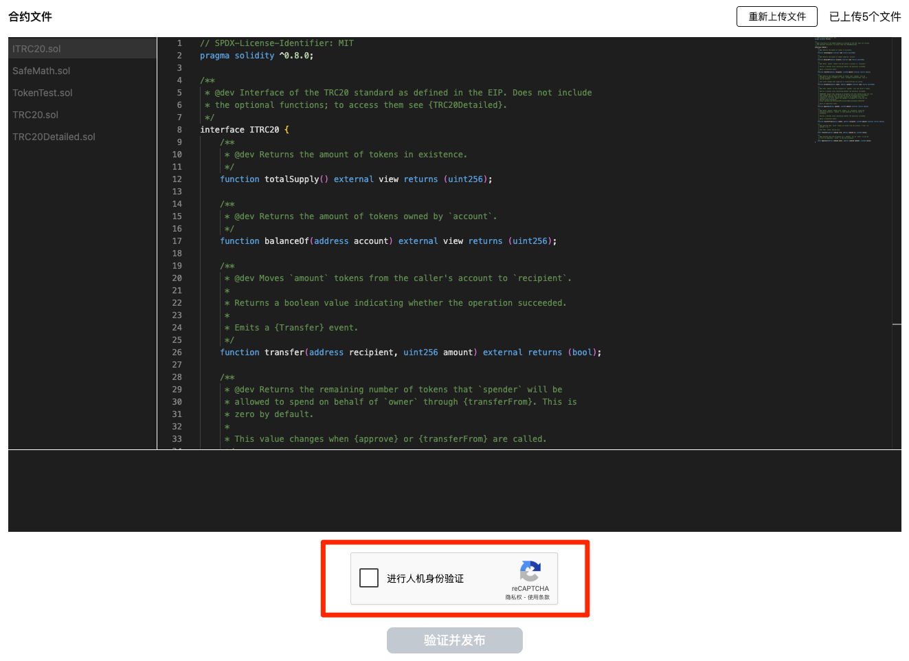 在点击 “验证并发布” 提交合约验证信息之前,Tronscan 会弹出 Google reCAPTCHA 组件进行人机身份验证(如下图所示)。如果该组件无法正常加载,可能是由于当前网络无法访问 Google 服务,建议检查网络连接。