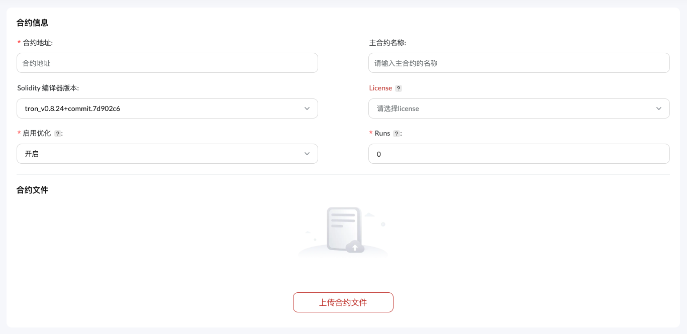 注意:Tronscan 暂不支持目录结构的合约验证。如果您的合约文件结构中包含子目录(如 contracts/、libs/ 等),请在验证前对合约进行“扁平化”处理,即将所有依赖合并为一个 .sol 文件。具体操作方法请参考 Tronscan官方指南。