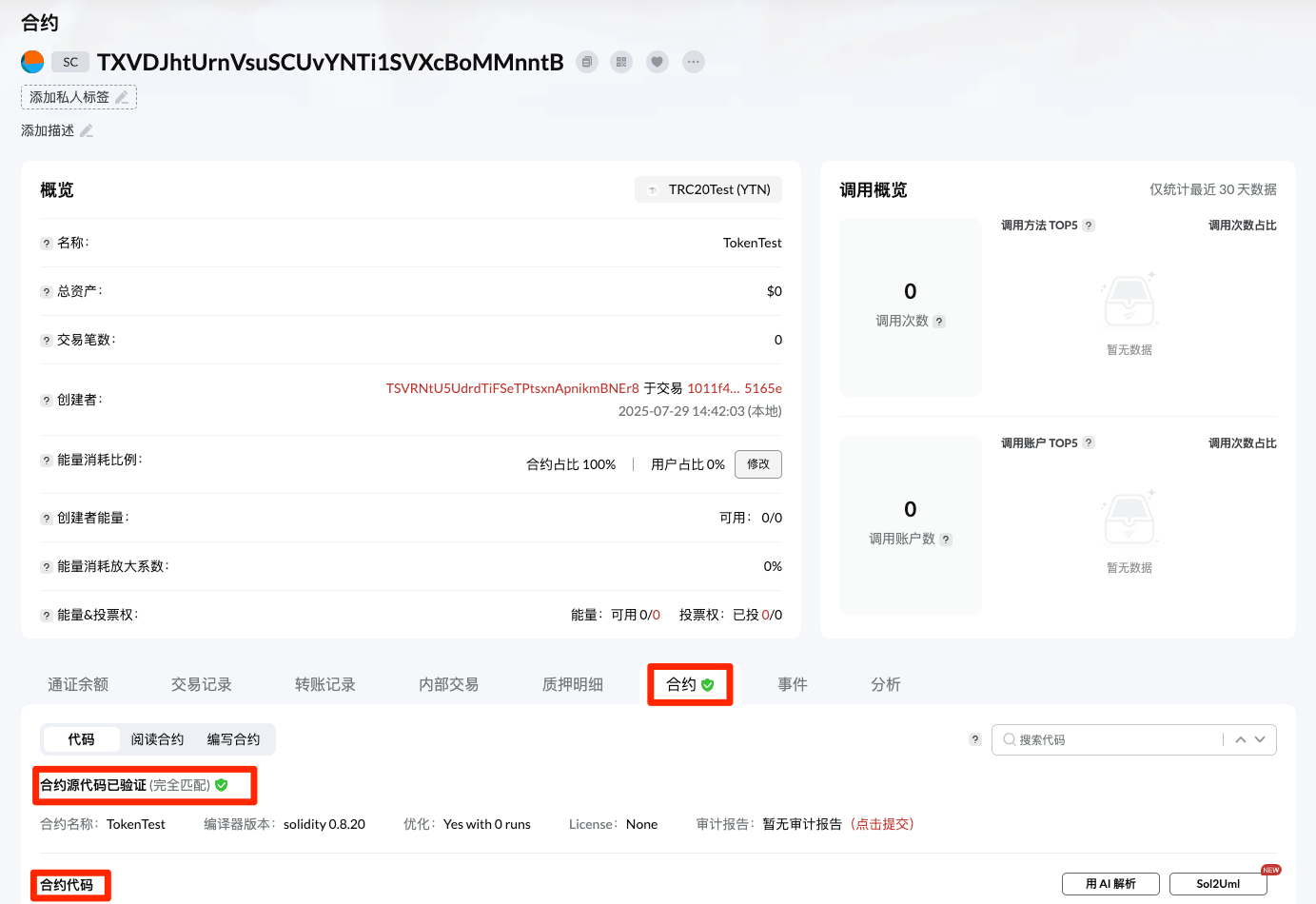 Tronscan 将自动比对您提交的源代码与链上部署的字节码。如果验证通过,系统将显示“恭喜您合约已验证成功!”的提示信息。随后,您可以前往合约页面查看已公开的合约源代码信息。