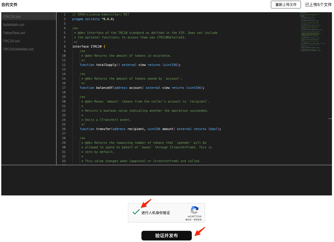 您可以通过 Tronscan 提供的在线验证工具对已部署的合约进行验证。请访问 Tronscan 合约验证工具 开始验证流程。
