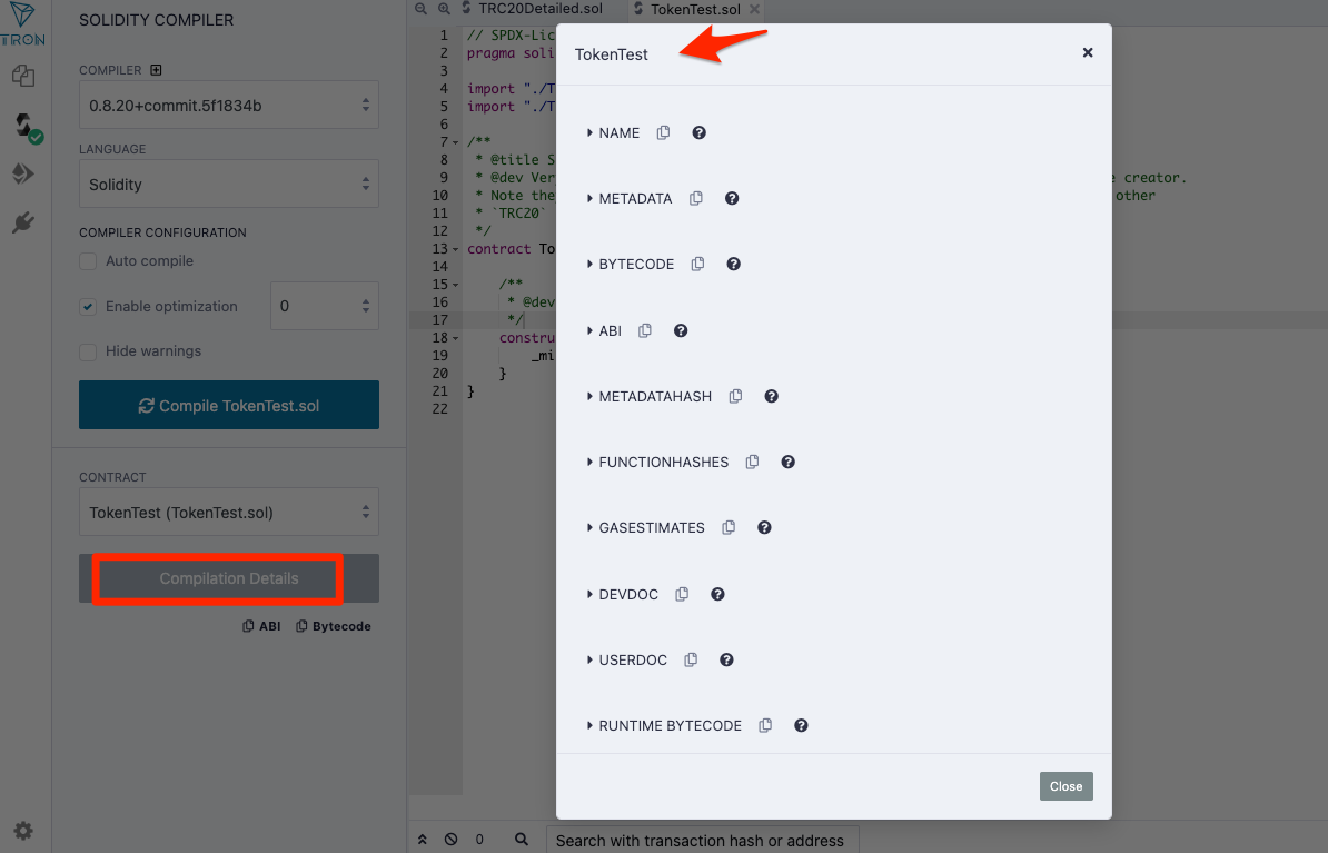 在成功的编译后,您将通过单击编译选项卡下的 Compilation Details 按钮来查看智能合约数据。 详细信息包含合约名称,ABI和bytecode等。